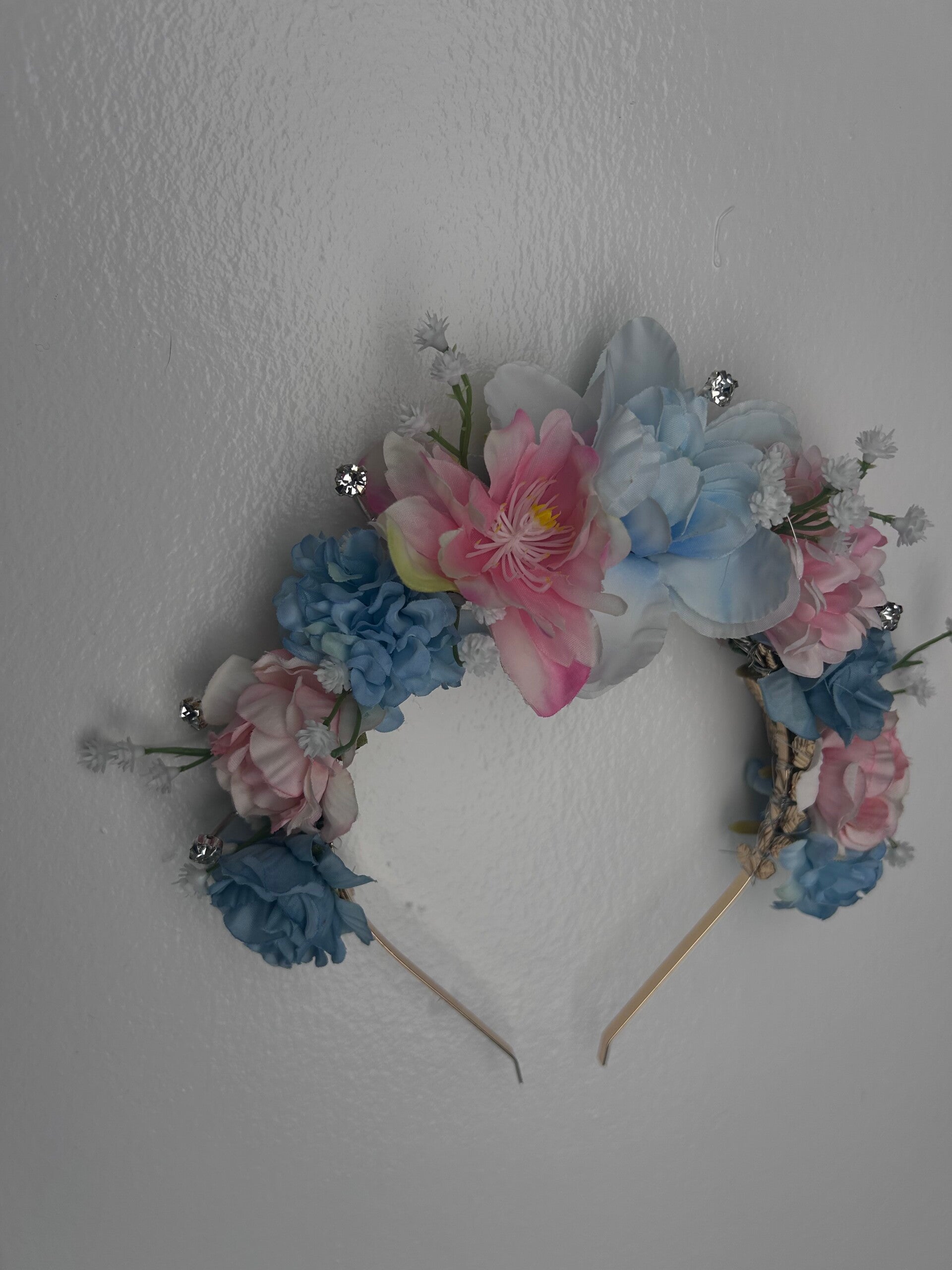 A handmade beautiful pink and blue headband with silver diamond detailing. Perfect for any occasion especially gender reveals.